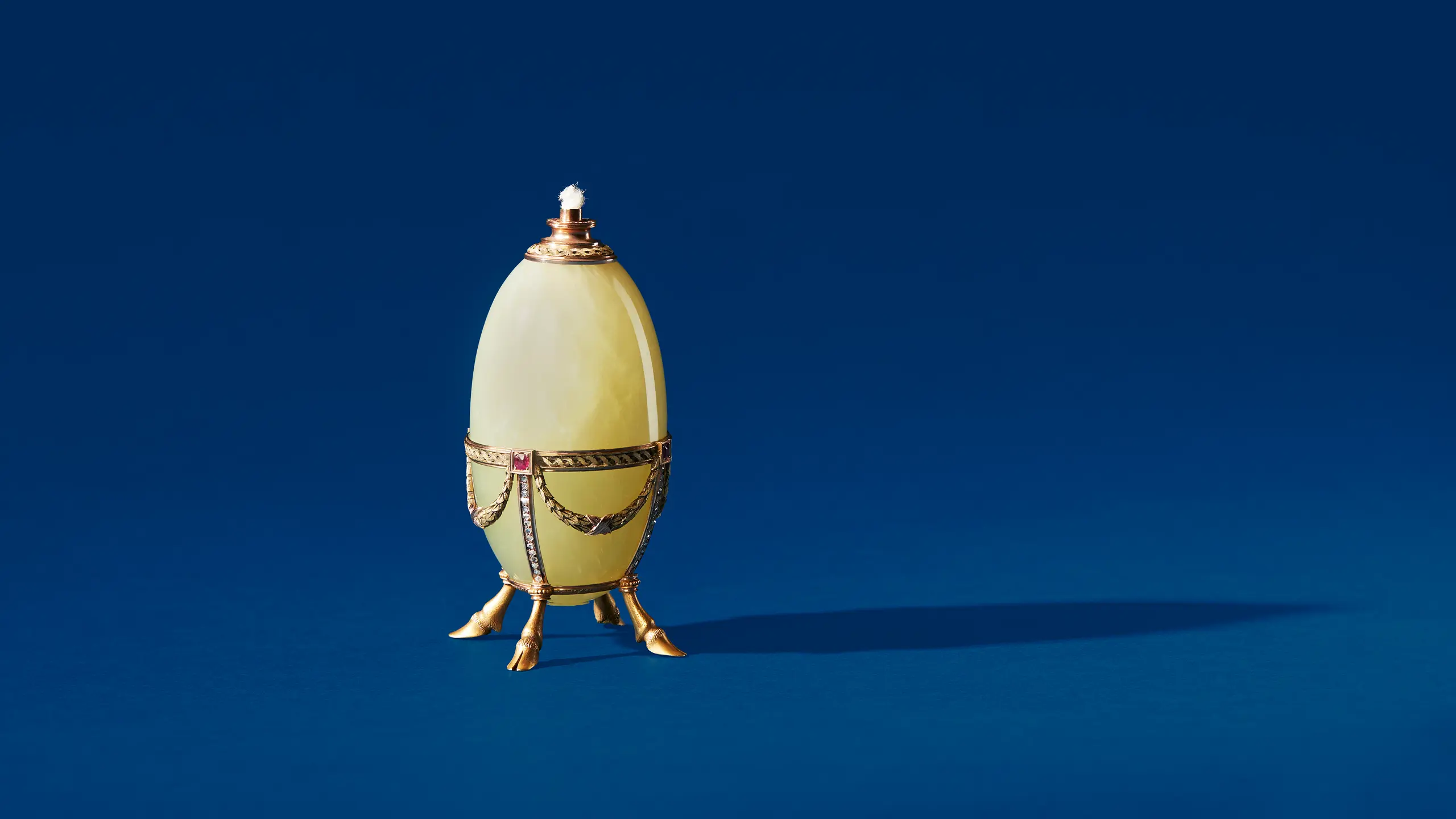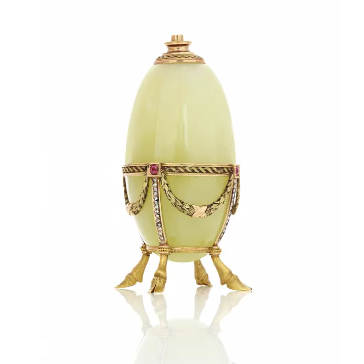 Fabergé, værkfører M. Perkhin, Skt. Petersborg 1890’erne. Tilhører H.K.H. Prinsesse Benedikte. Bordlighter i bowenit med form som et aflangt æg. Æggets nedre del er sat i et lille stativ i guld, hvor en omkransende ring, diamantbesatte bånd og fire guirlander mødes i firkantede guldindfatninger med hver en rubin. Ægget står på fire støbte hjorteklove – et legende indfald, som er typisk for Fabergé.