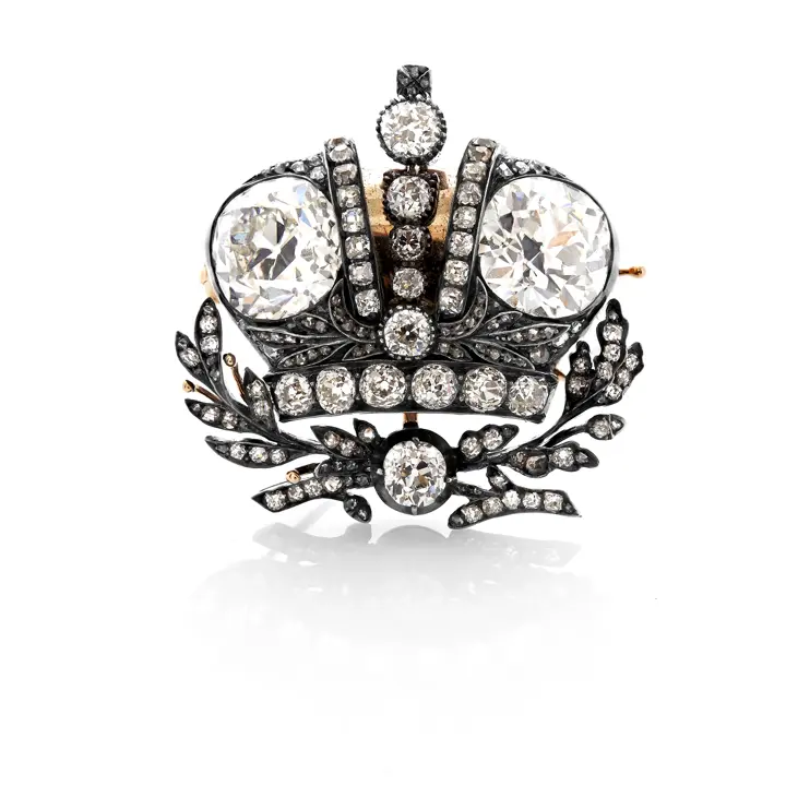 Fabergé, værkfører A. Holmström, Skt. Petersborg 1896. Diamantbesat broche med form som den russiske kejserkrone, udført i atten eksemplarer i anledning af Nikolaj 2.s kroning i Moskva 1896. Givet til alle daværende storfyrstinder af Rusland, heriblandt storfyrstinde Anastasia, som gav denne broche videre til sin datter, dronning Alexandrine. Der kendes i dag kun til to andre bevarede kroningsbrocher. Brochen er testamenteret til Kongernes Samling af dronning Alexandrines barnebarn, prinsesse Elisabeth (1935-2018).