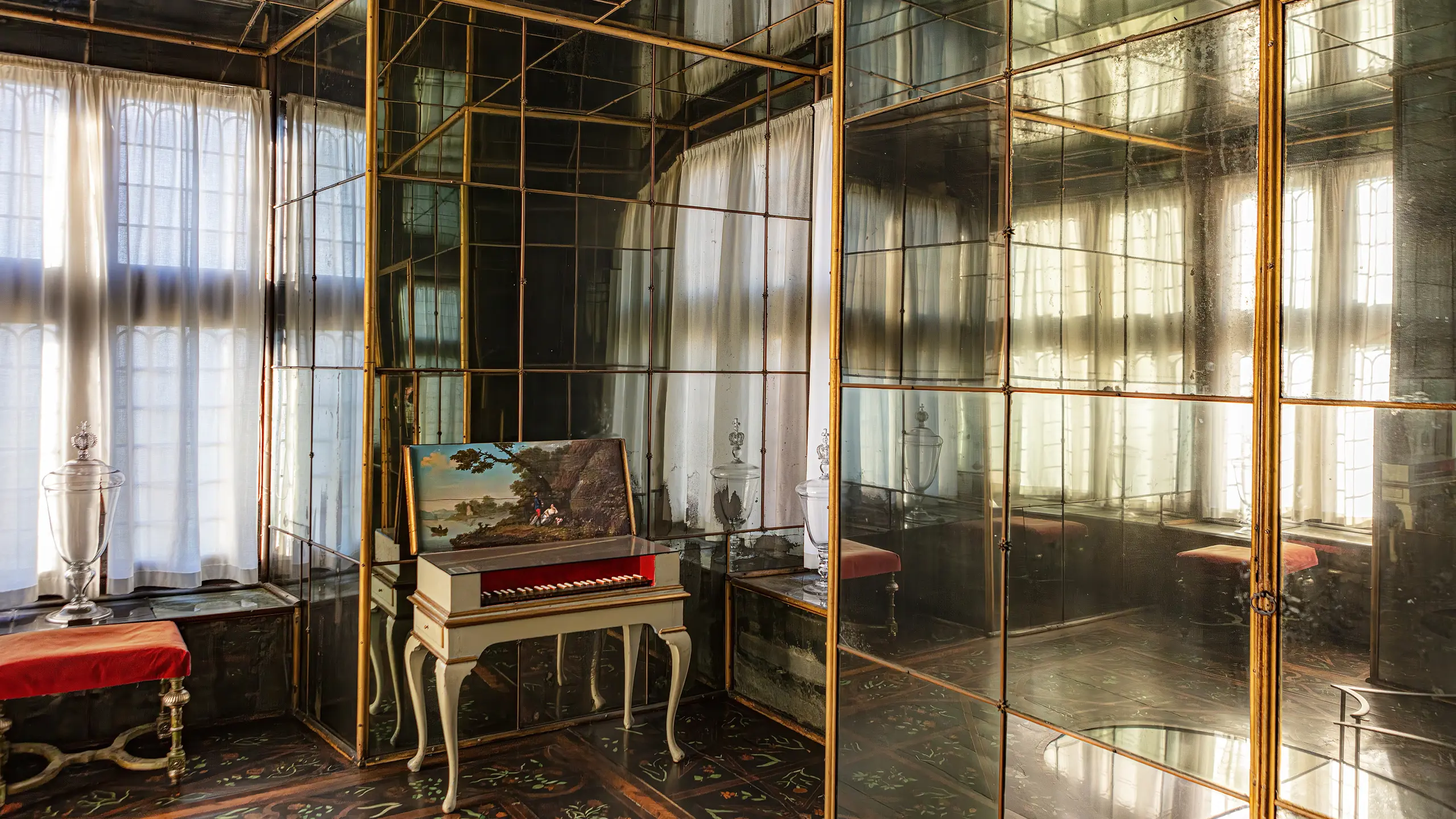 This small Mirror Cabinet was originally created for Christian V in 1684–1687. Some time later, in 1705, Frederik IV added the parquet floor with the embedded mirror. Now, the room not only had mirrors on the walls and in the ceiling but also on part of the floor.