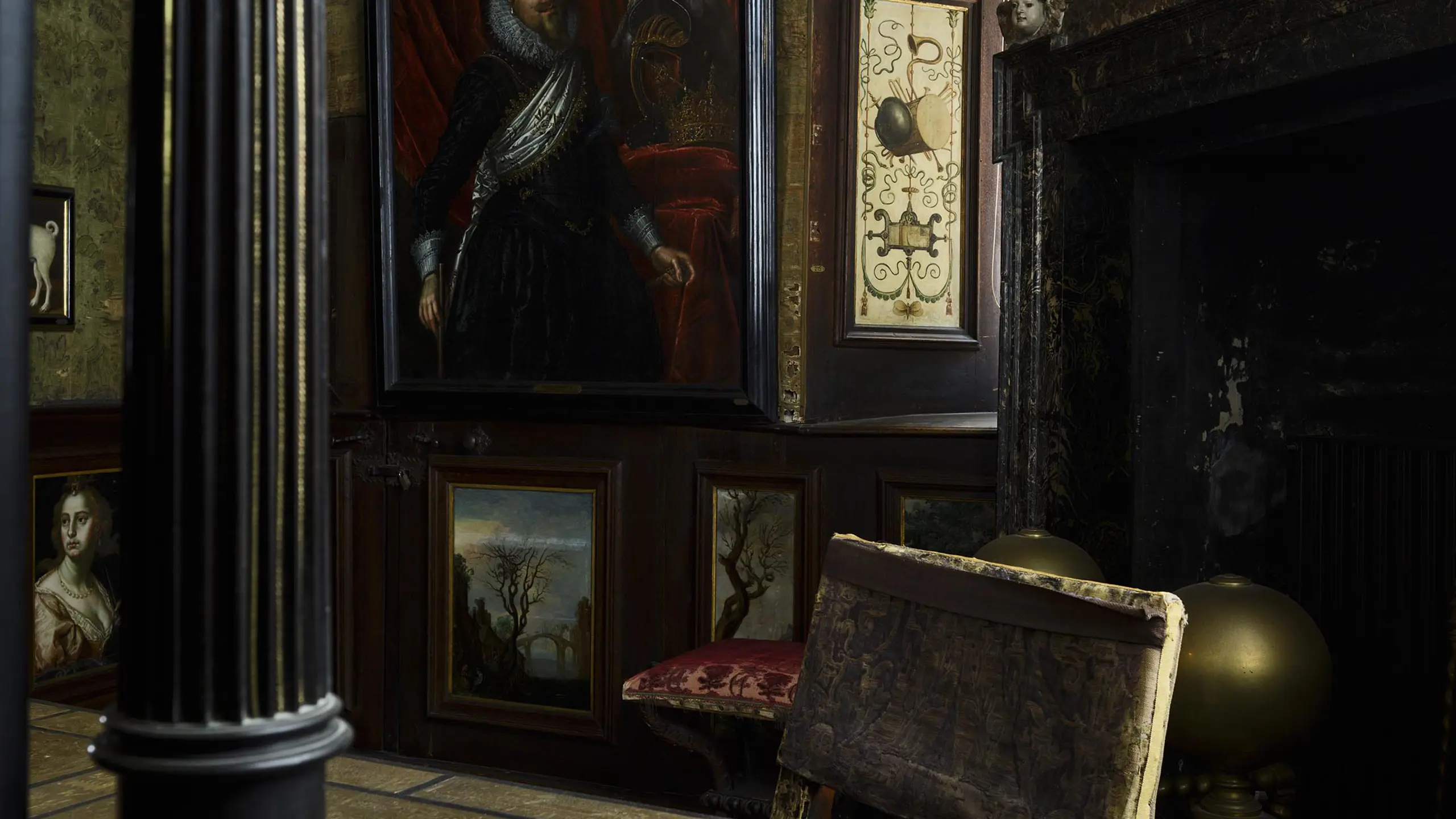 Exceptionally, most of the original interior in this room has been preserved since Christian IV’s time – from the ceiling paintings, with scenes from the Italian epic Orlando Furioso, to the panels with embedded paintings, and the fireplace. However, we do know that the wall coverings of green silk with printed gold ornaments date from around 1700.