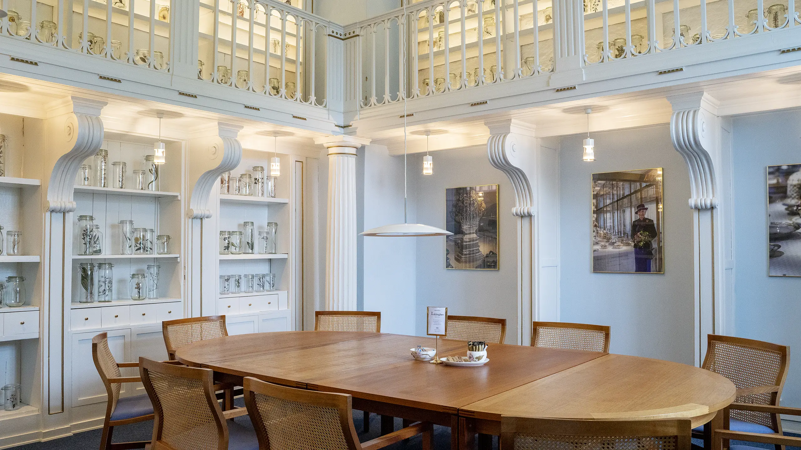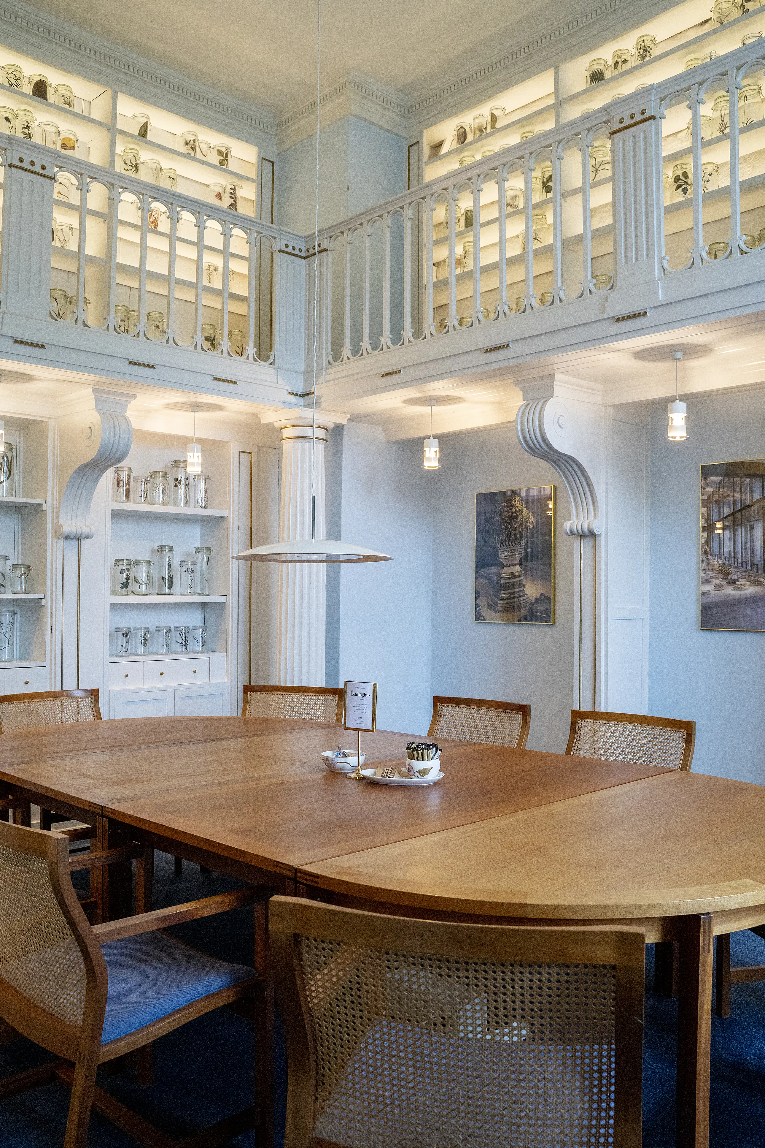 Midt i den stemningsfulde Flora Danica-udstilling, som er en del af Bibliotekssalen, finder du Flora Danica-værelset – et elegant og lyst mødelokale i Louis Seize-stil. Rummet er præget af klassiske søjler og en smuk gallerigang, og interiøret stammer oprindeligt fra det gamle Kongelige Bibliotek i København.