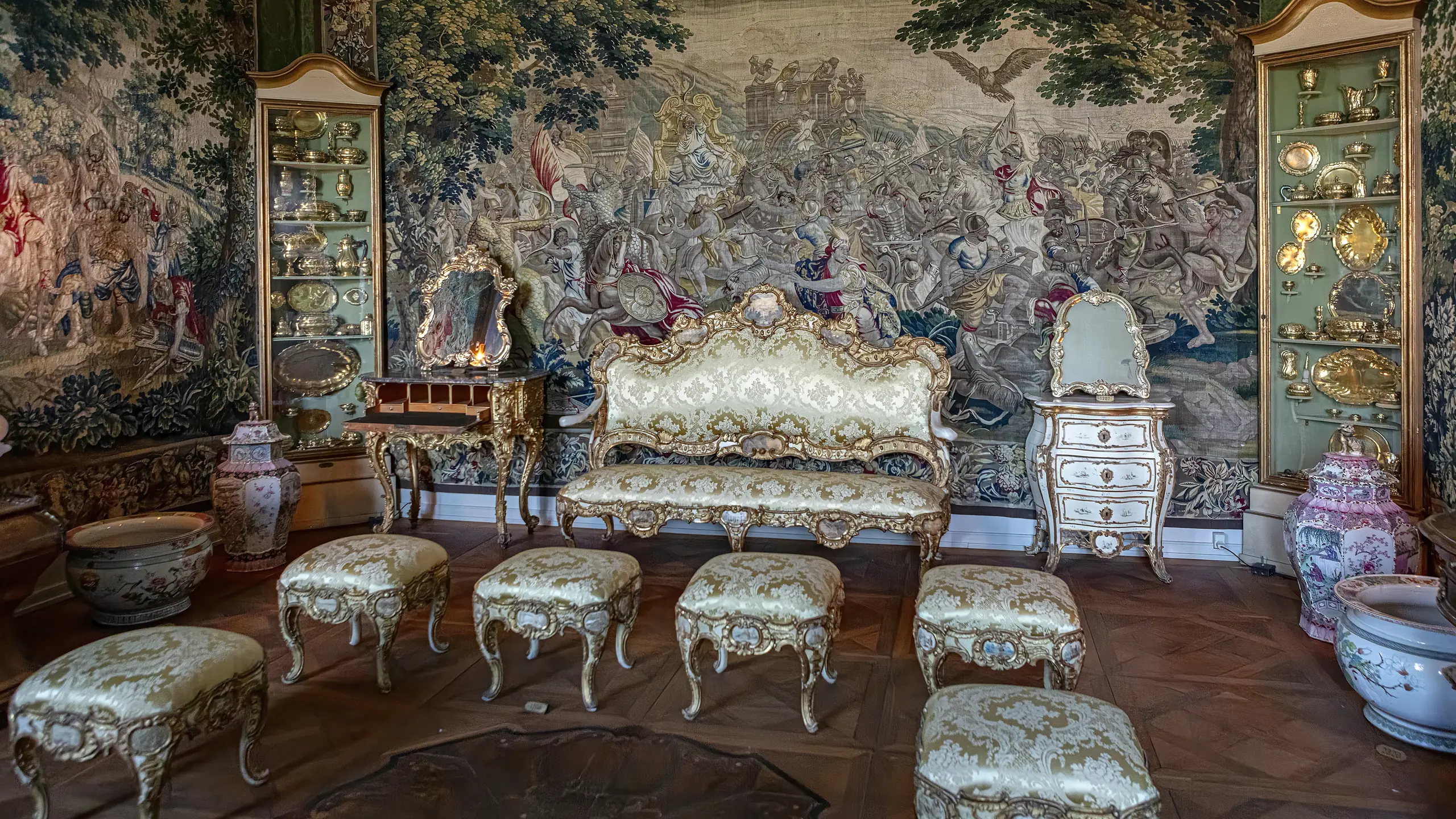 1206Sofa og taburetter. Hvidmalet og forgyldt træ med skæringer og kartoucher med malede motiver. Muligvis fremstillet i Venedig eller Sydtyskland omkring 1740. Reddet ved Christiansborg Slots brand 1794.
