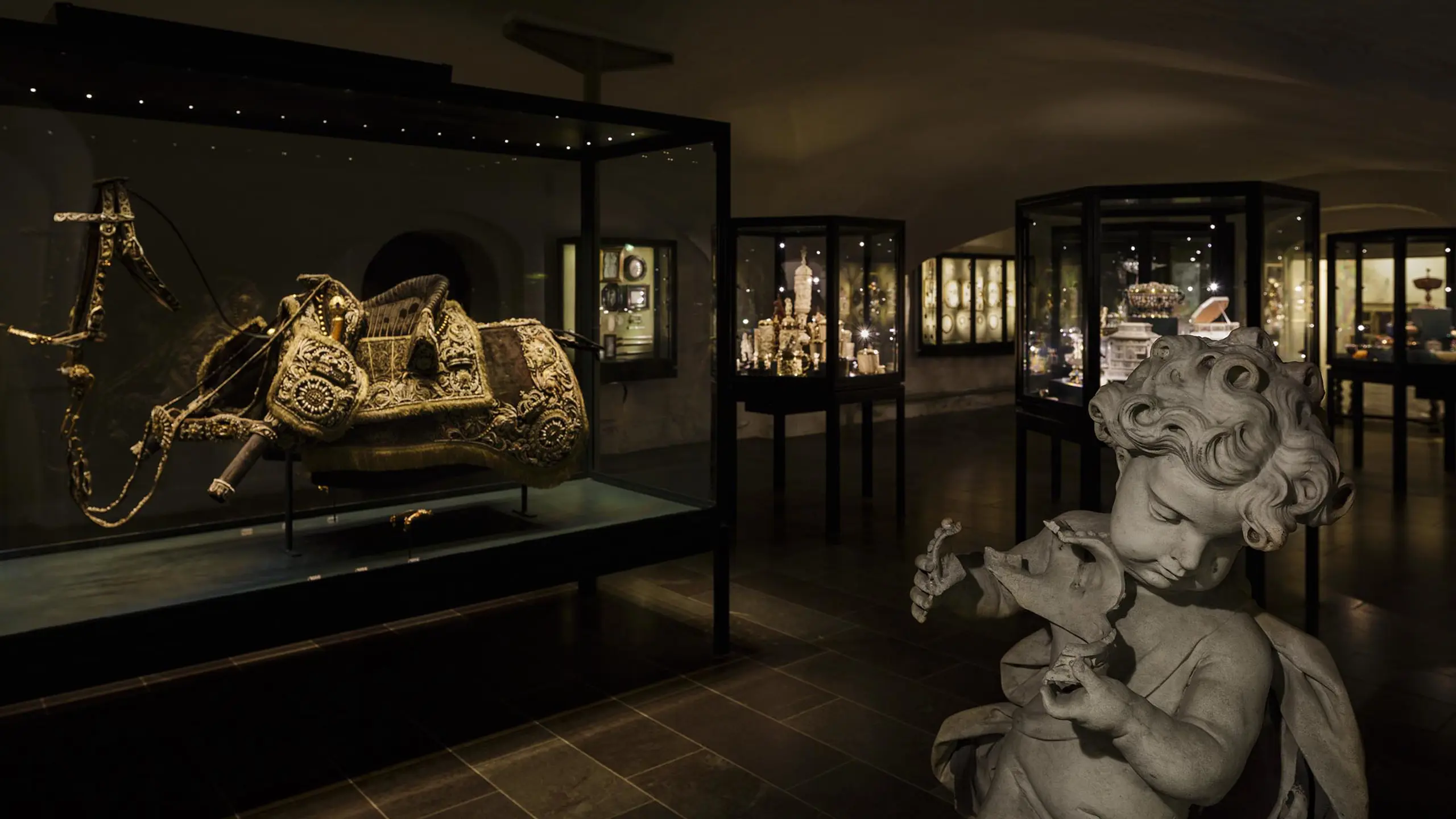 I dette nye Grønne Kabinet her i kælderen kan du se genstande, der spænder tidsmæssigt fra cirka 1200 til 1718. Samlingen her i lokalet repræsenterer en væsentlig del af, hvad der var tilbage af den kongelige arv efter reformationen i 1536 og 1600-tallets nederlag i Trediveårskrigen og svenskekrigene. De fleste genstande er fyrstegaver og stammer fra kongernes og dronningernes personlige samlinger.