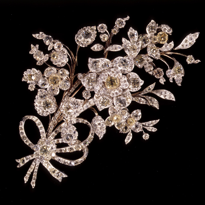 Brillantsættet består af en halskæde, en brystbuket og et sæt ørelokker.
