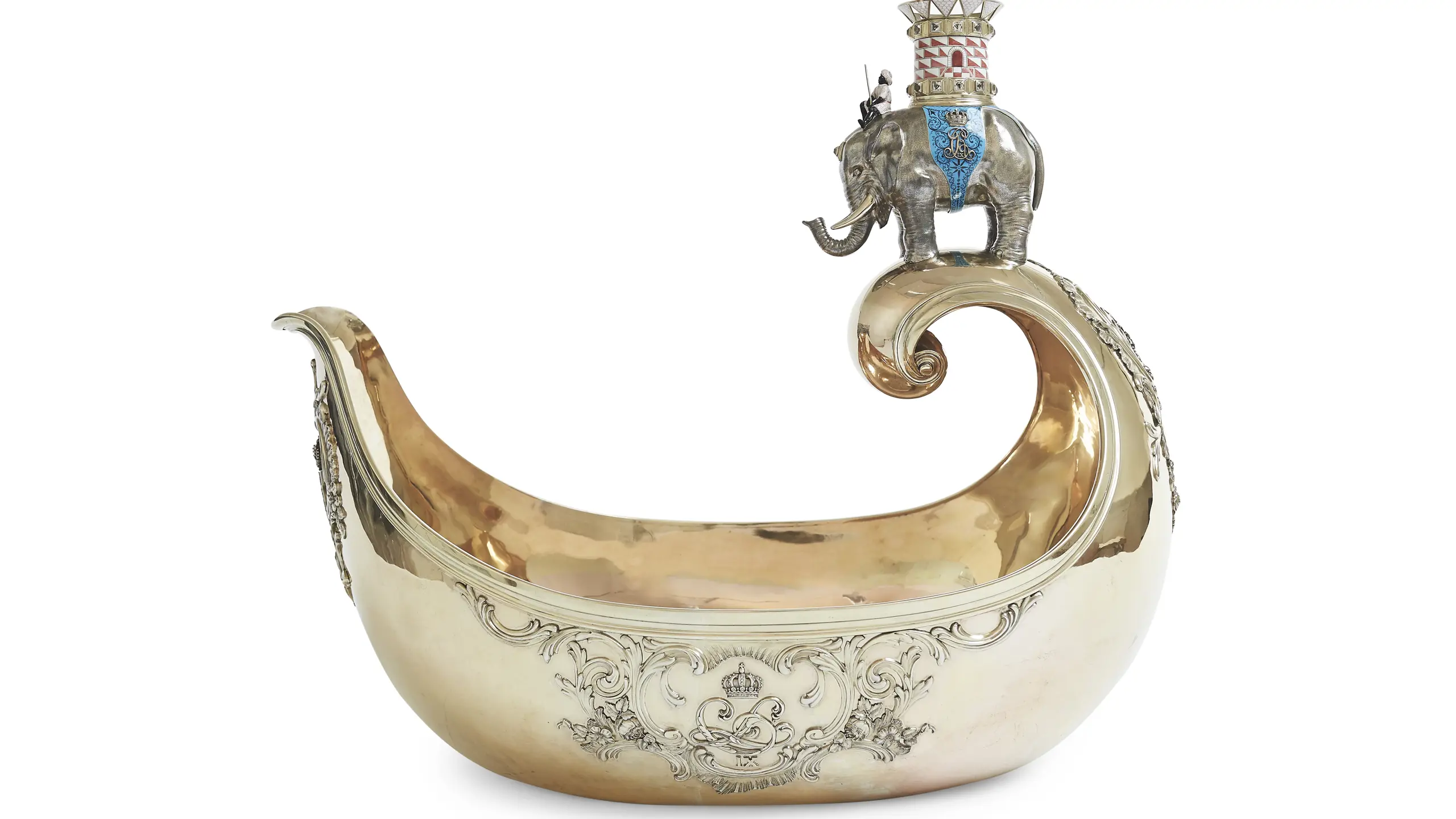 Champagnekøleren er blandt andet udformet som en såkaldt kovsj, en traditionel russisk drikkeskål, mens elefanten på toppen refererer til den danske elefantorden.